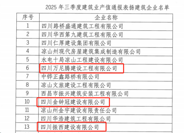 近日,建设公司下属四川万尼腾建设工程有限公司、四川金钟冠建设有限公司、四川振西建设有限公司在西昌市建筑工程事务中心2025年第三季度建筑产值报送工作中凭借积极的工作态度及产值方面的突出贡献入选表扬名单。
